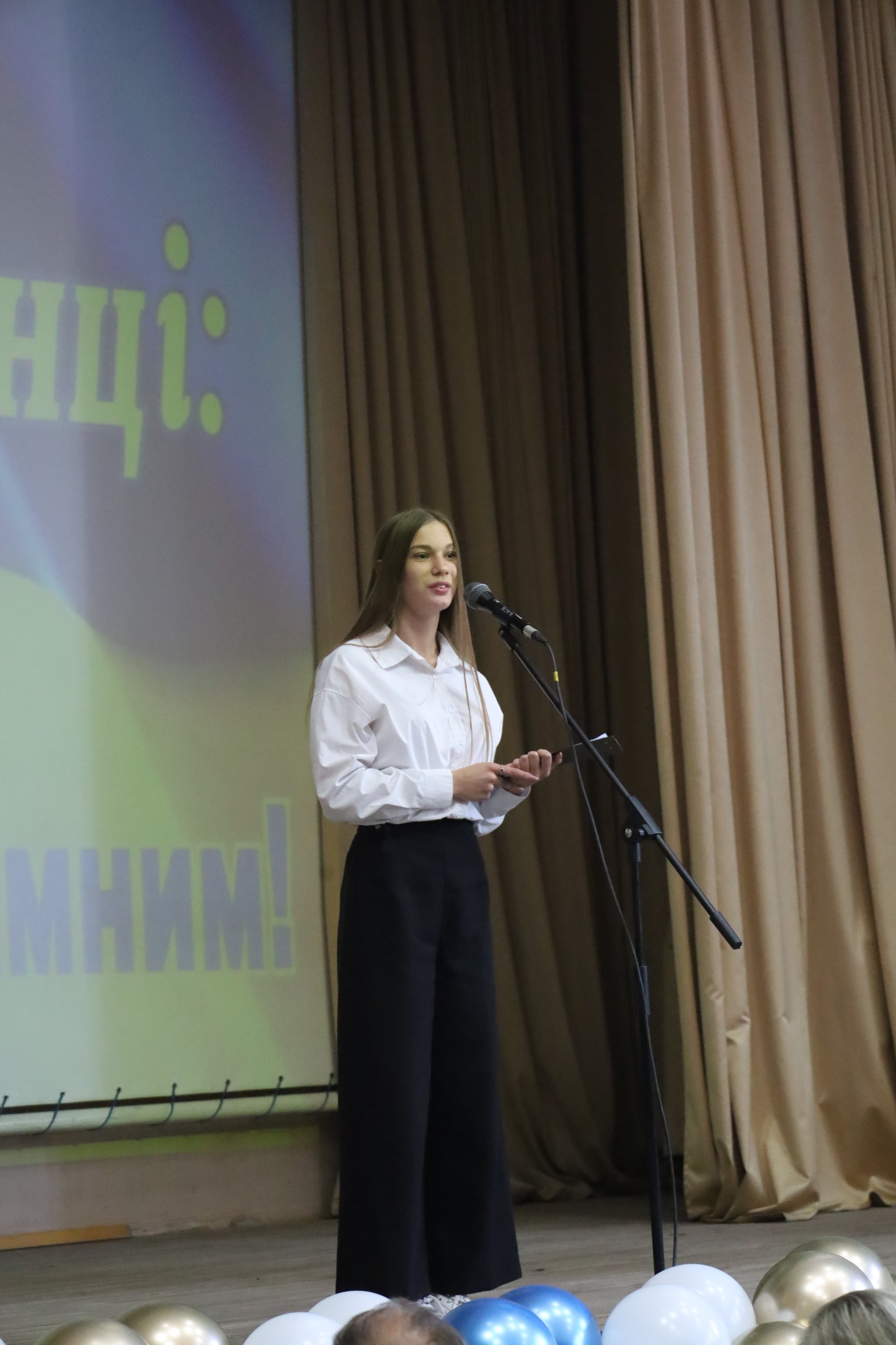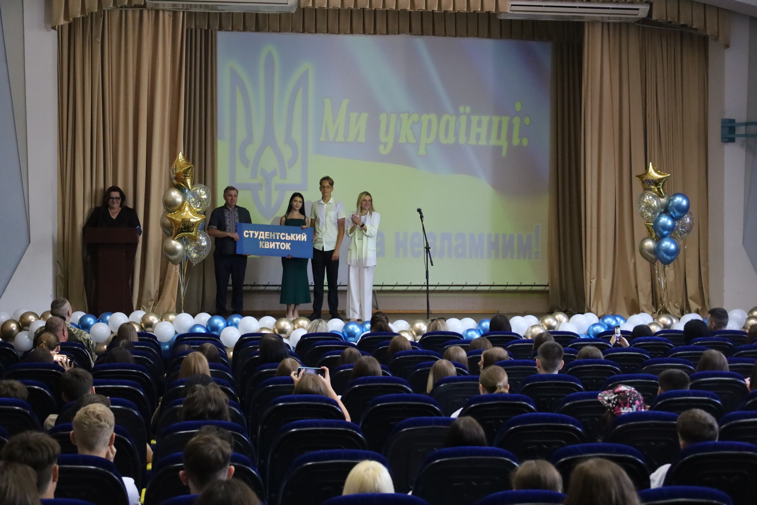 Вітальне слово пролунало і від студради: Валерія Пушкарська поділилася своїм досвідом навчання та запросила новачків до активної участі в громадському та культурному житті коледжу.